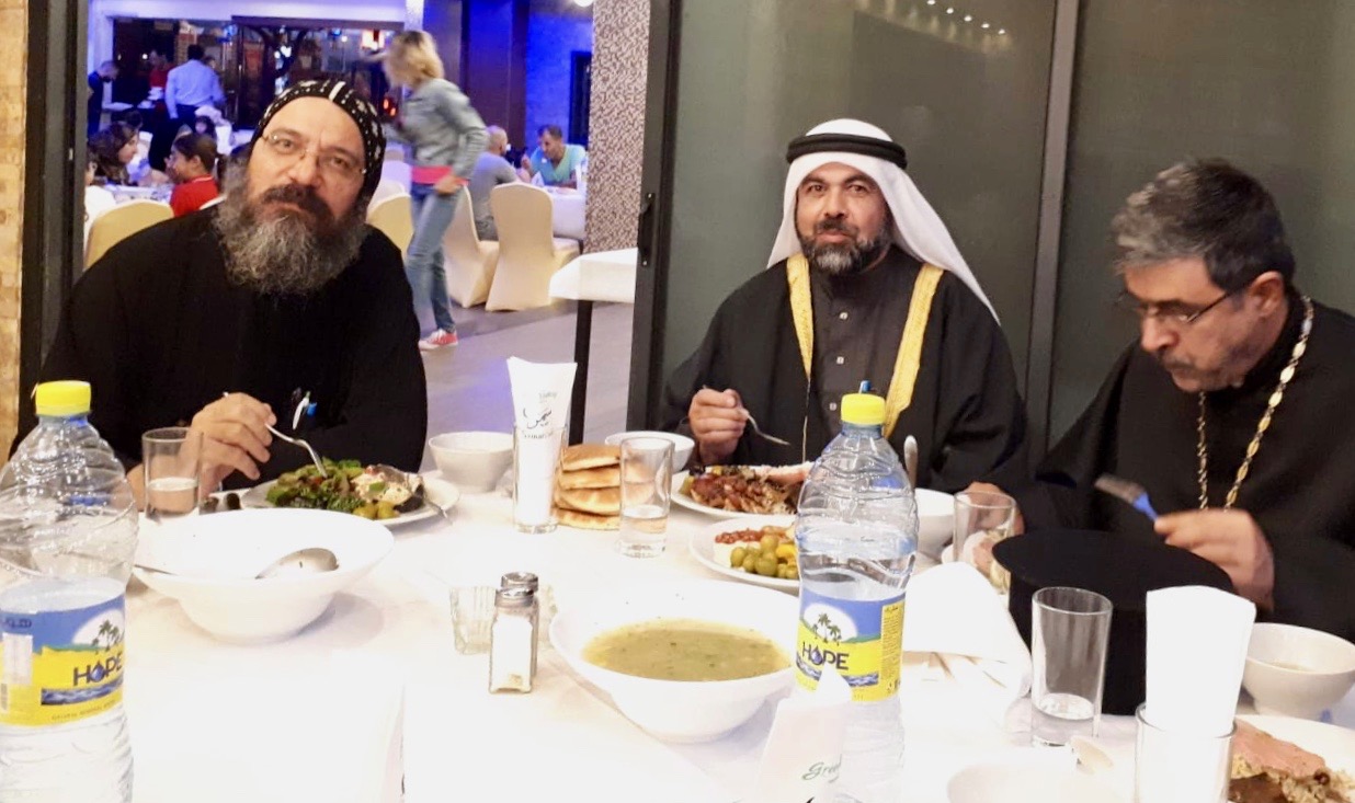 When we arrive at the restaurant where the Iftar will be held, we see a large banner outside for the Abrahamic Reunion, written in Arabic and in English. The private banquet room is made of stone and has stained glass windows. There are six large round tables with twelve place settings at each table.