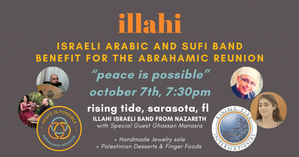 Join us on Zoom, or in person at Rising Tide International, in Sarasota, FL, where there will be Palestinian/Arab-Israeli foods, and hand-made jewelry for sale as well.