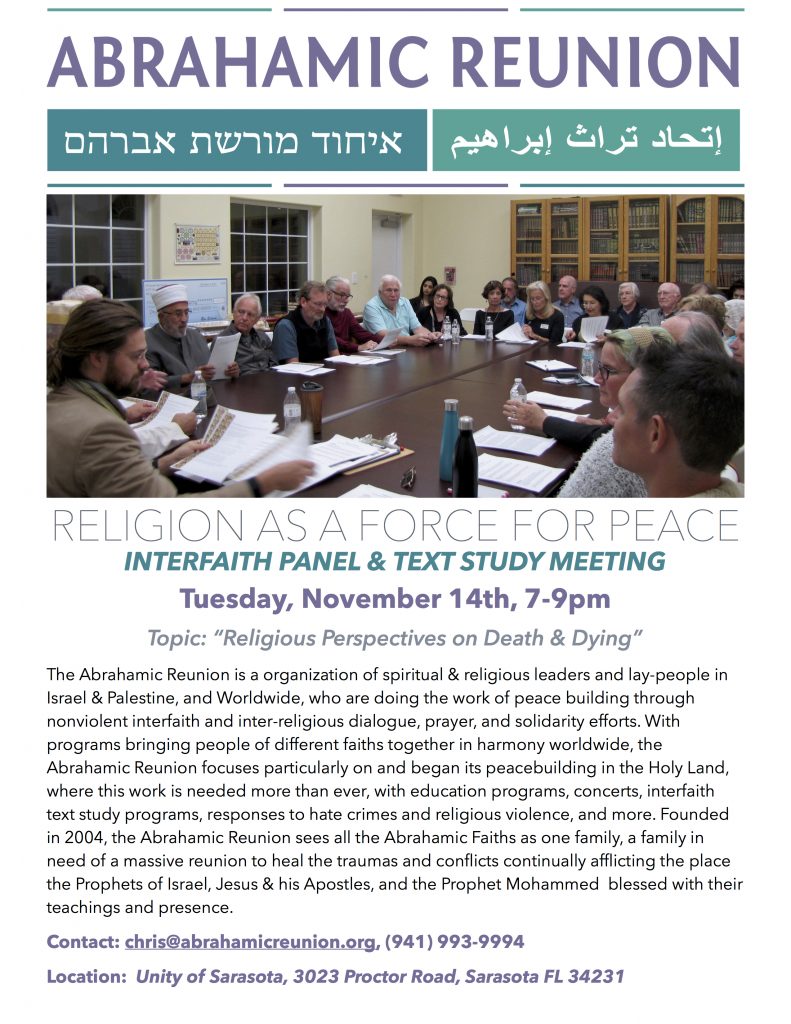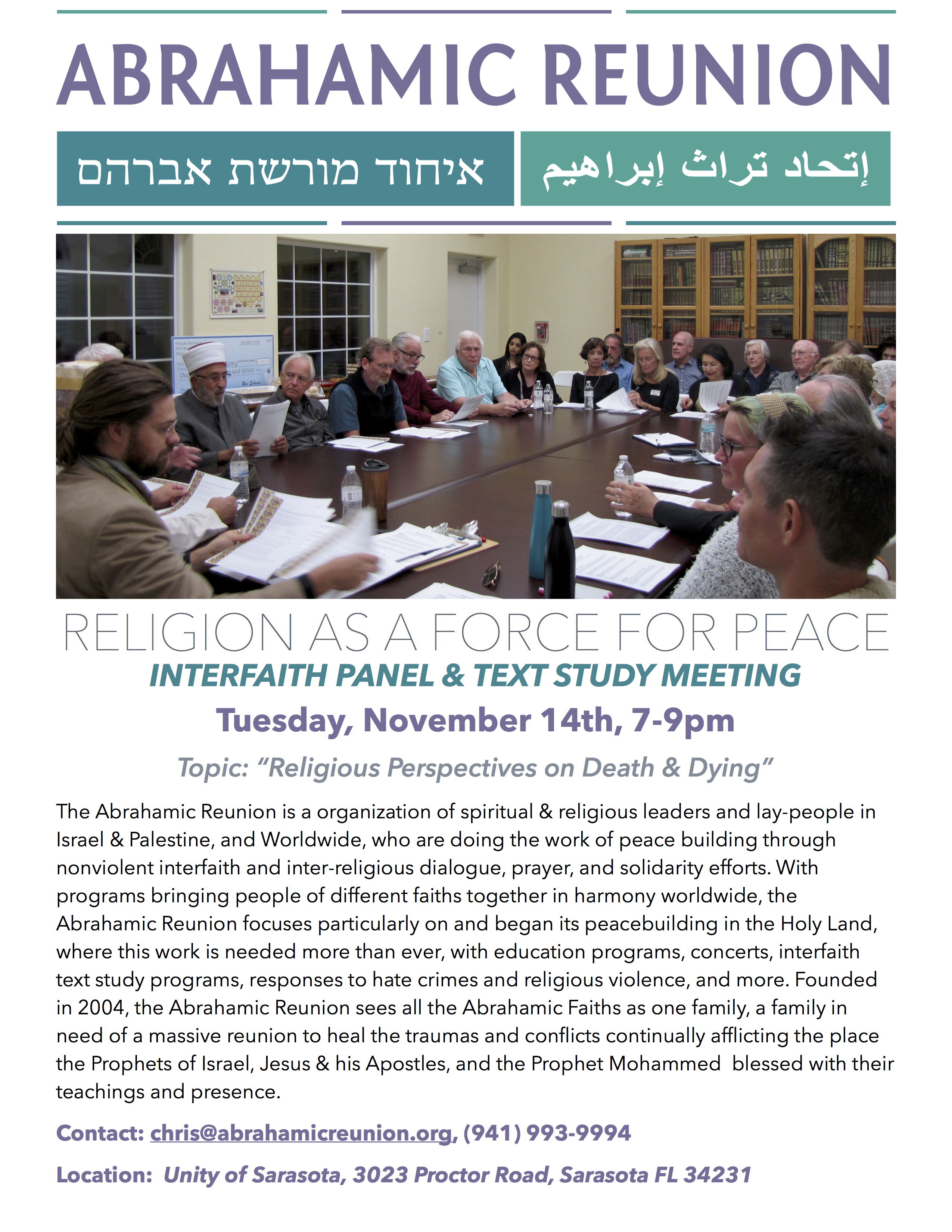 Please join the AR for an evening of peace-building, conversation, sharing, and contemplation of “Religious Perspectives on Death & Dying” in the Abrahamic faiths.