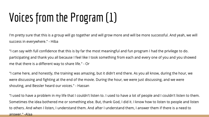 - “I can say with full confidence that this is by far the most meaningful and fun program I had the privilege to do. participating and thank you all because I feel like I took something from each and every one of you and you showed me that there is a different way to share life.” – Or