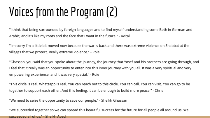 - “Ghassan, you said that you spoke about the journey, the journey that Yosef and his brothers are going through, and I feel that it really was an opportunity to enter into this inner journey with you all. It was a very spiritual and very empowering experience, and it was very special.” – Roie