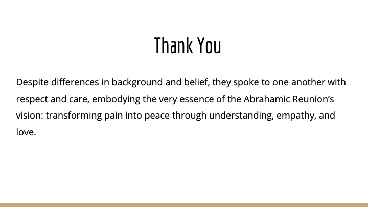 Throughout the week, participants demonstrated maturity, compassion, and courage. Despite differences in background and belief, they spoke to one another with respect and care, embodying the very essence of the Abrahamic Reunion’s vision: transforming pain into peace through understanding, empathy, and love.