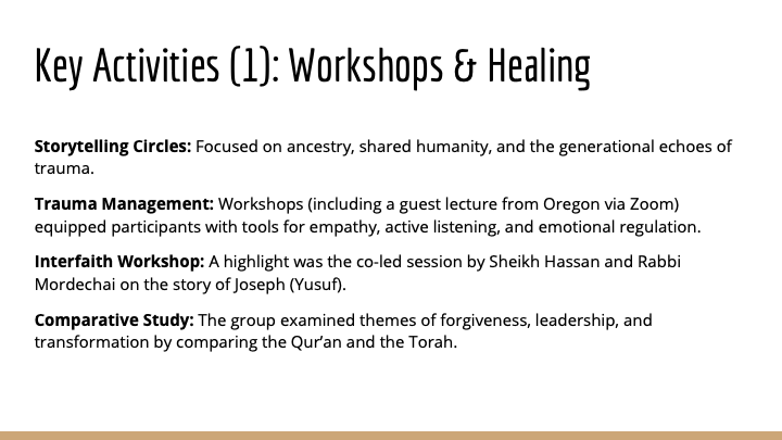 A highlight of the program was the interfaith workshop on the story of Joseph (Yusuf), co-led by Sheikh Hassan and Rabbi Mordechai. Through comparative study of the Qur’an and the Torah, the group examined themes of forgiveness, leadership, and transformation through hardship. Participants drew philosophical inspiration from Ibn Arabi and Maimonides, exploring how suffering can serve as a crucible for renewal. A creative writing exercise invited participants to rewrite Joseph’s story from their own perspectives, yielding profound insights about humility, agency, and divine trust.