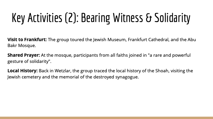 The group also visited Frankfurt, where they toured the Jewish Museum, Frankfurt Cathedral, and the Abu Bakr Mosque. At the mosque, Jewish, Christian, Druze, and Muslim participants joined together in a moving moment of shared prayer- a rare and powerful gesture of solidarity. Back in Wetzlar, they traced the local history of the Shoah, visiting the Jewish cemetery and the memorial of the destroyed synagogue.