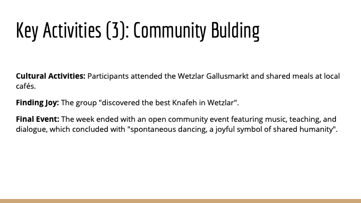 Cultural and social activities rounded out the week: participants attended the Wetzlar Gallusmarkt, shared meals at local cafés and discovered the best Knafeh in Wetzlar. The final evening featured an open community event, where Sheikh Ghassan and Sheikh Abed presented the Abrahamic Reunion’s mission through music, teaching, and dialogue. The evening ended in spontaneous dancing, a joyful symbol of shared humanity.