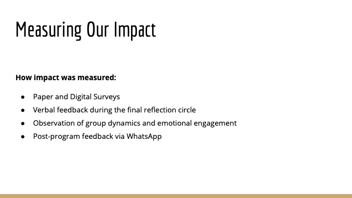 - Participants reported significant growth in empathy, intercultural understanding, and personal healing.