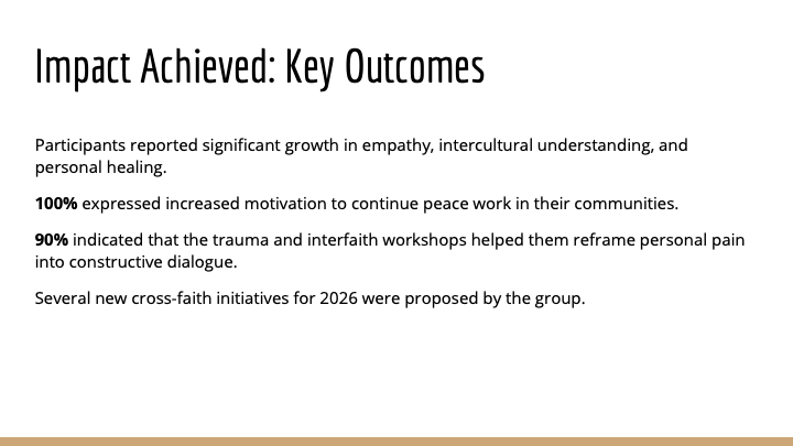 - 90% indicated that trauma and interfaith workshops helped them reframe personal pain into constructive dialogue.