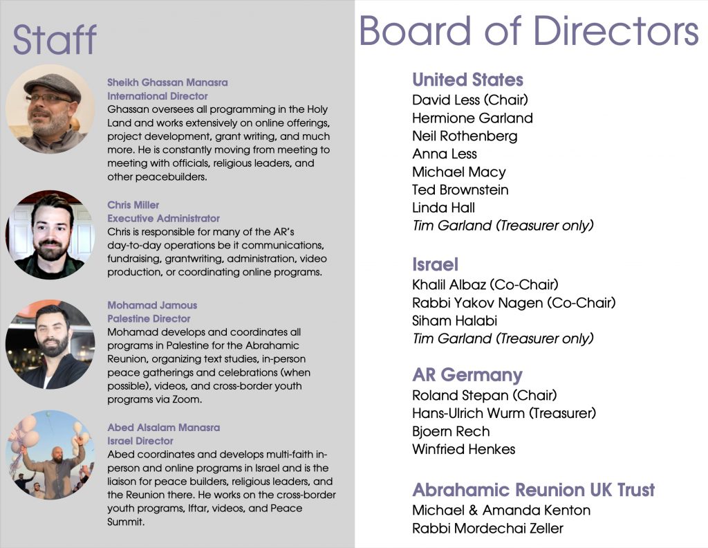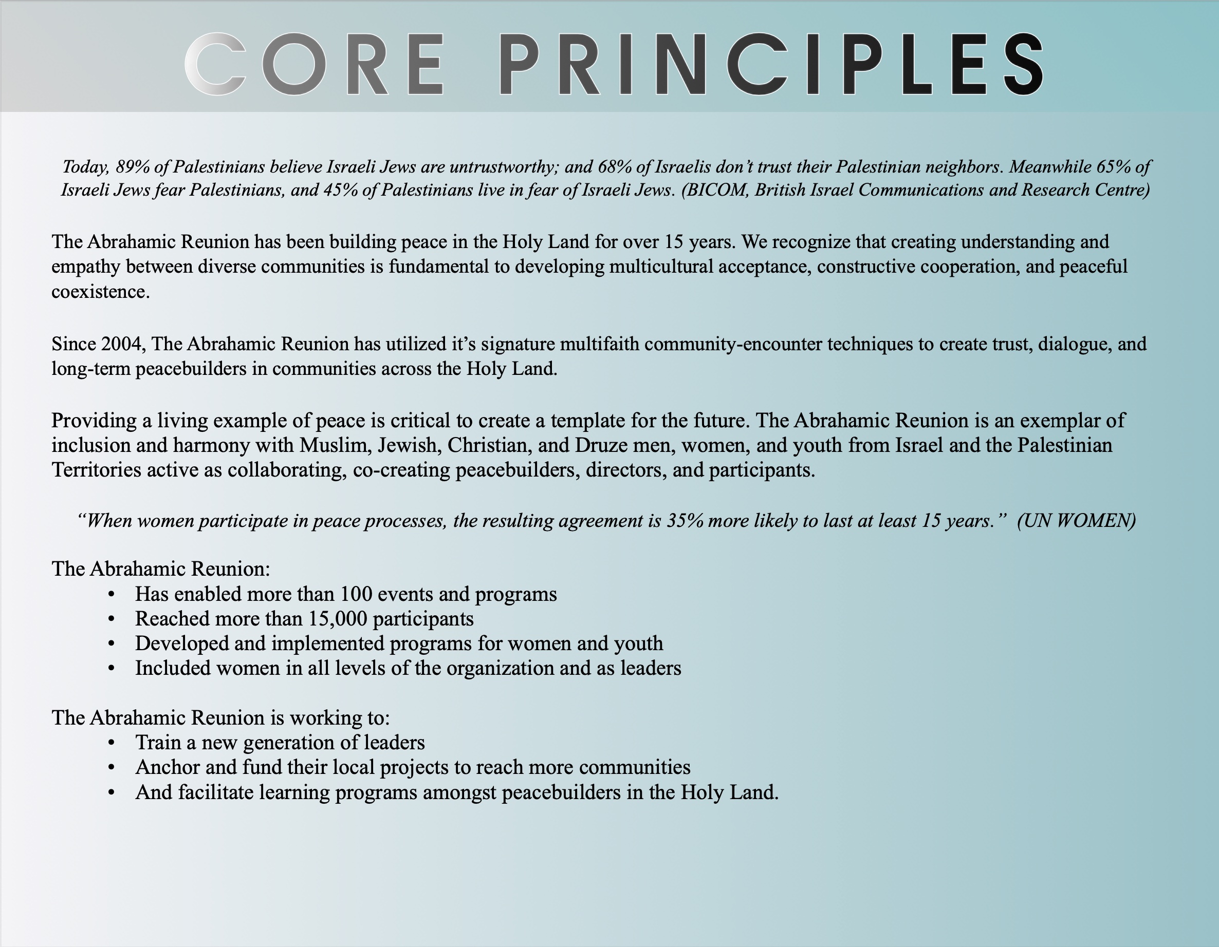 The Abrahamic Reunion is a team of spiritual peacemakers dedicated to uplifting human consciousness and building peace in the Holy Land and around the world by opening hearts to the love and wisdom of all spiritual traditions.