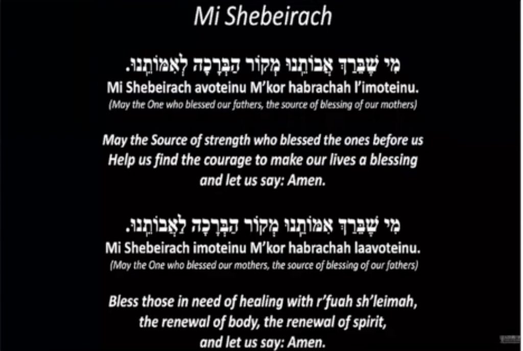 In these times of tremendous uncertainty when so many are feeling anxiety and stress, the comfort and sense of peace that prayer actually brings is really a wonderful thing, and I want to conclude with some of the words that Debbie Friedman said, and she said,” We are powerful, it is hard to remember that. Sometimes life takes its turns into the unknown, and presents us with challenges that we would preferred not to have encountered under any circumstances. Suddenly we are confronted with our pain. It is a strange thing that pain creates beauty, and potential for healing. It’s hard to imagine that it could provide a foundation for beautiful moments to arise, we attempt to find a way to manage survival from one minute to the next, as pain becomes the overreading force. When we are experiencing emotional discomfort, we need to find a safe place to express our grief and loss. It is with this concept in mind, that we recite the Mi Shebeirach, the prayer for healing, which is a English translation of the original prayer. With this prayer, you become the messenger, we are not just the receivers of blessings, but the messengers of blessings as well. Out of what emerges from life’s painful challenges we come to our healing, and ultimately our greatest healing will come when we use our suffering to heal another’s pain.
